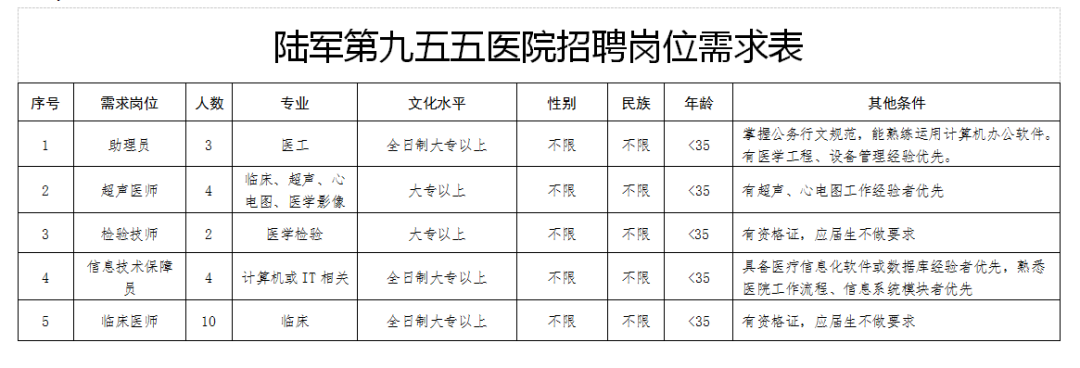 为提高我院医疗保障能力,经陆军第九五五医院党委研究决定,拟面向社会公开招聘工作人员,现将有关事宜公告如下。