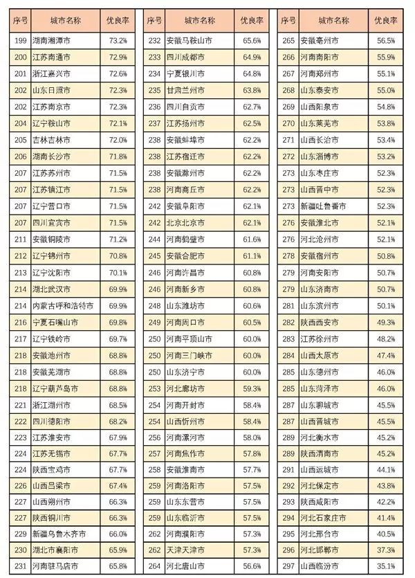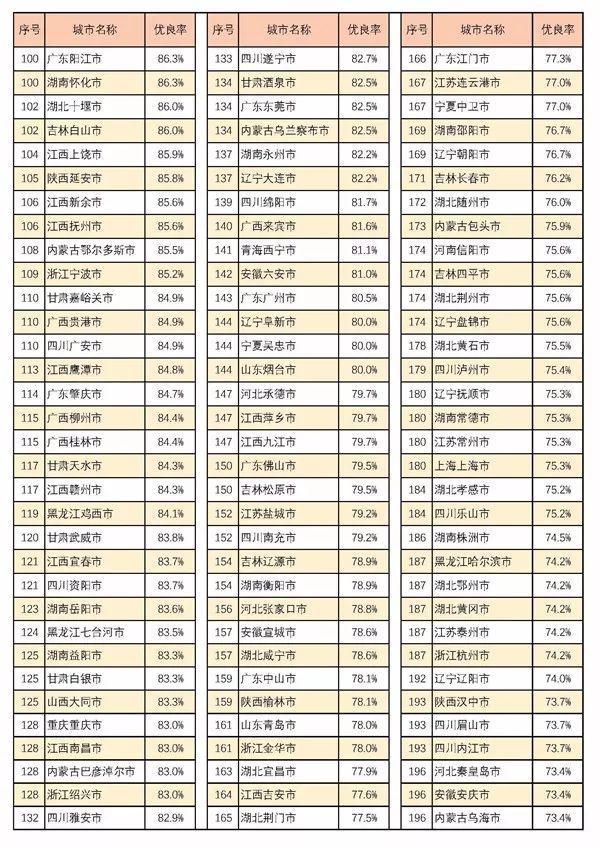 《报告》同时对这些地级及以上城市空气质量优良率进行了排序,西藏昌都市和云南丽江市并列第一,山西临汾市垫底。其中,前100名城市中,东北地区13个、东部地区33个、中部地区6个、西部地区49个,分别占各地区城市数量的38.2%、37.5%、7.5%和51.6%。即西部地区超过一半城市跻身全国前100名,而中部地区只有不到十分之一进入。