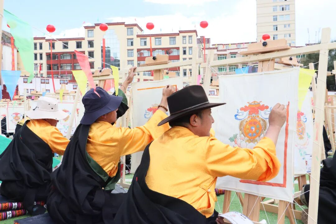 授课结束后,身穿藏族服饰的千名唐卡画师坐姿呈盘曲缠绕形,全神贯注投入到唐卡创作中。