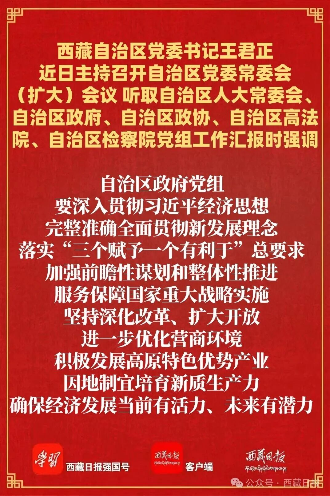 王君正强调,开局关乎全局、起步决定后程,做好2026年工作意义重大。各党组要在以习近平同志为核心的党中央坚强领导下,在自治区党委的团结带领下,统一意志、形成合力,充分发挥把方向、管大局、保落实的领导作用,聚焦“四件大事”聚力“四个创建”,坚定履行职责使命,切实发挥职能作用,努力实现“十五五”良好开局。自治区人大常委会党组要坚持党的领导、人民当家作主、依法治国有机统一,提高立法质量,努力把西藏经济社会发展过程中形成的好经验、好做法上升为规律性认识,通过制度形式固定下来,推动西藏工作规范化、科学化、法治化;提高监督效能,在全面监督、重点监督上下功夫,增强监督针对性实效性,加强和改进代表工作,提升代表履职能力。自治区政府党组要深入贯彻习近平经济思想,完整准确全面贯彻新发展理念,落实“三个赋予一个有利于”总要求,加强前瞻性谋划和整体性推进,服务保障国家重大战略实施,坚持深化改革、扩大开放,进一步优化营商环境,积极发展高原特色优势产业,因地制宜培育新质生产力,确保经济发展当前有活力、未来有潜力。自治区政协党组要坚持党的领导、统一战线、协商民主有机结合,找准政协履职的切入点发力点,切实把各族各界群众紧密地团结在党的周围,为建设社会主义现代化新西藏凝聚人心、汇聚力量。自治区高法院、自治区检察院党组要贯彻落实习近平法治思想,忠实履行法律赋予的职责使命,全面提高司法服务质量,不断提升履职能力和水平,为长治久安和高质量发展作出更大贡献。