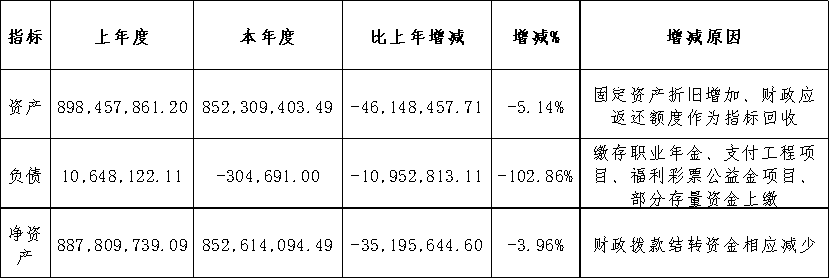 2022年资产年末较上年增加-46,148,457.71元,增长率-5.14%;2022年末负债较上年增加-10,952,813.11元,增长率-102.86%;2022年净资产年末较上年增加-35,195,644.60元,增长率-3.96%;