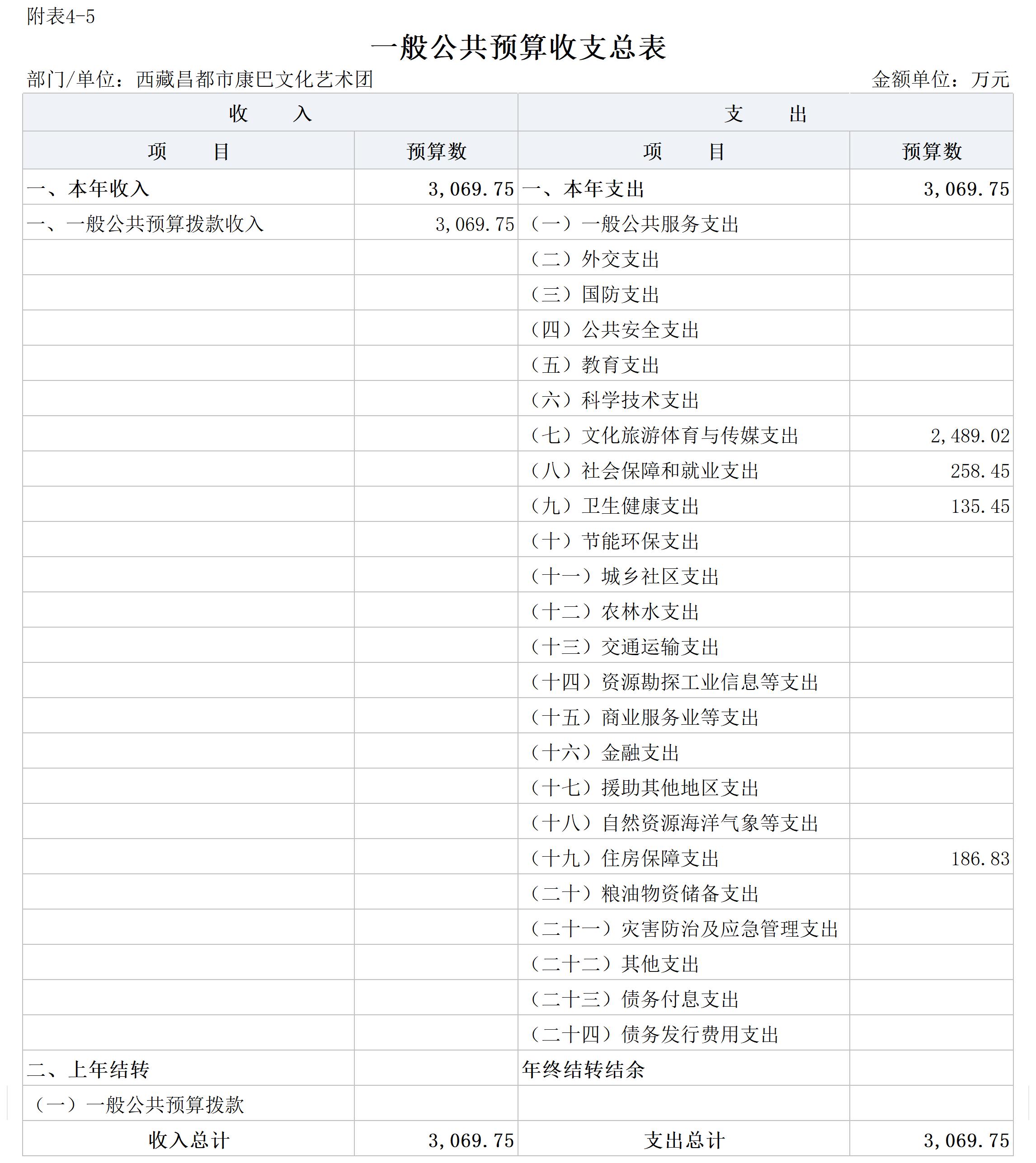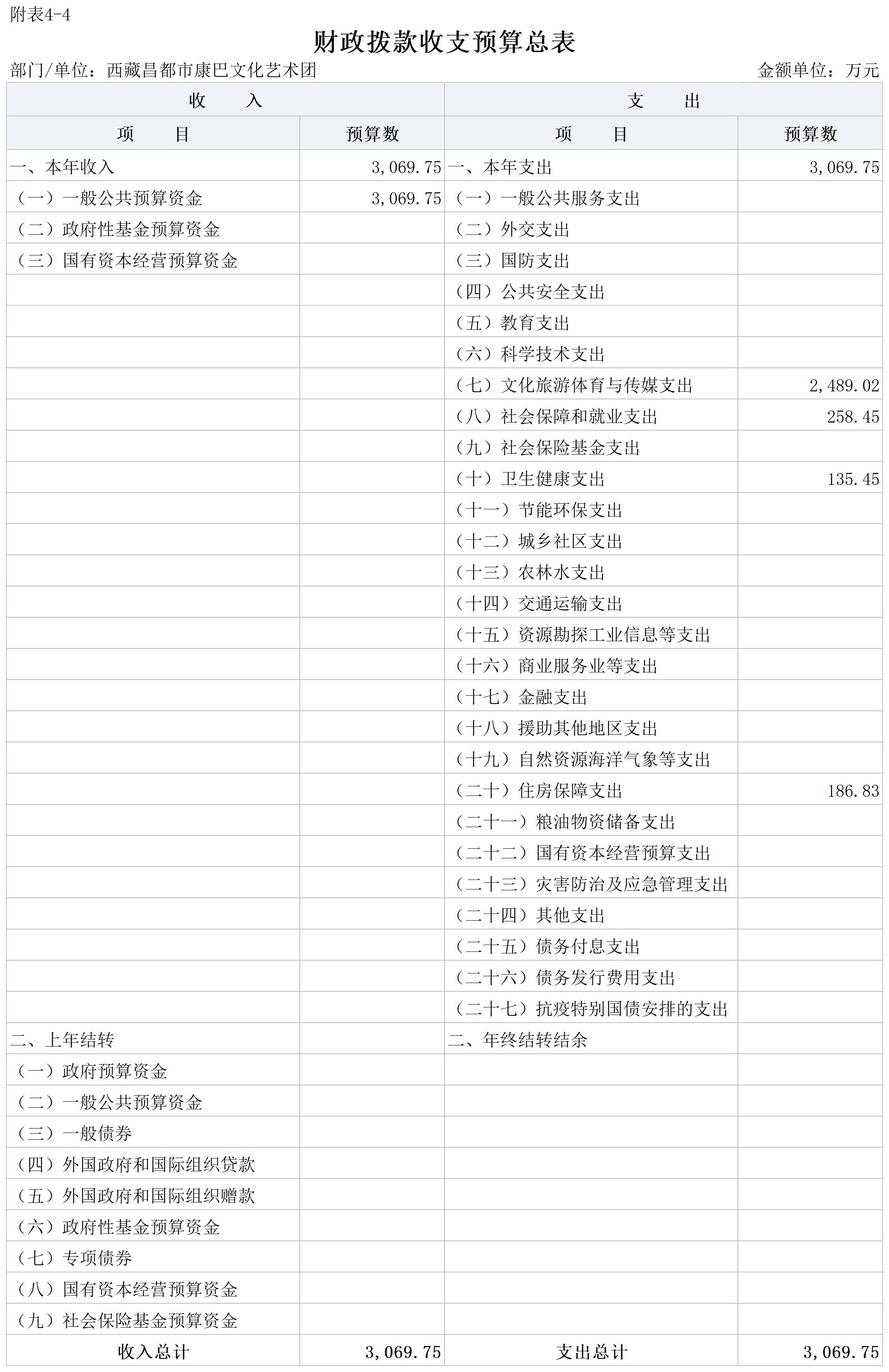 昌都市康巴文化艺术团2025年财政拨款收入3069.75万元,为一般公共预算收入,无政府性基金预算收入;2025年支出3069.75万元,为艺术表演团体支出。