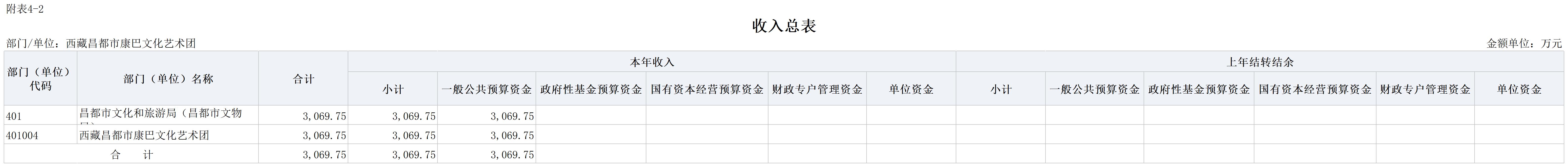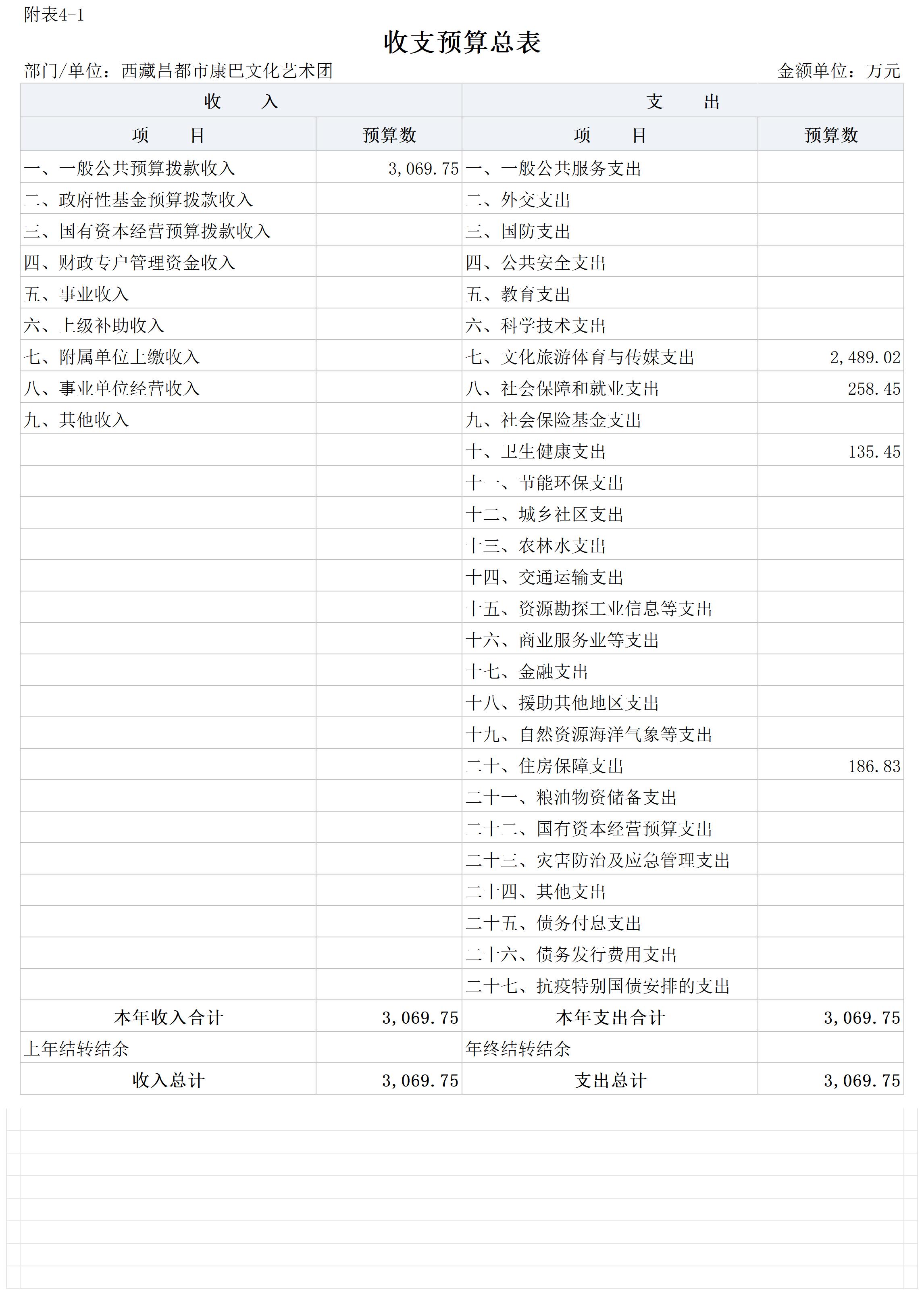 昌都市康巴文化艺术团2025年收入预算3069.75万元,财政拨款收入占100%。