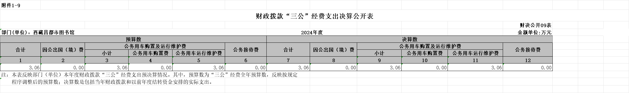 2024年度财政拨款“三公”经费支出决算中,因公出国(境)费支出决算0.00万元,占0.00%;公务用车购置及运行维护费支出决算3.06万元,占100%;公务接待费支出决算0.00万元,占0.00%。具体情况如下: